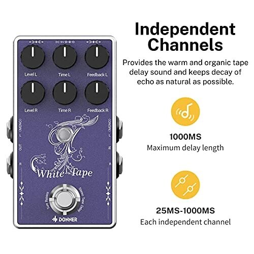 The Donner Tape Delay Pedal delivers warm tape echo with a spacious stereo field through independent left/right channels. Simple three-knob control per channel for Time, Feedback, and Level, with true bypass and versatile for guitars, keyboards, synths, and more.