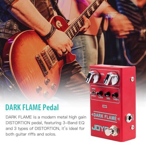 The JOYO R-17 Dark Flame is a high gain distortion pedal with three selectable distortion sounds. It is designed for optimal and quiet operation when powered by a 9V DC mains power supply with noise reduction technology. It features a 3‑band precision equalizer (LOW, MID, HIGH) for adjusted bass, mid, and treble frequencies. The pedal offers three distortion tones accessible via a selector switch. The classic R Series design includes a compact form factor with LED mood lights. Dimensions are 11 x 6.5 x 4.8 cm and the weight is 248 g. It is compatible with guitar and bass and supports distortion, overdrive, fuzz, chorus, and other effects. True bypass circuitry ensures the effect is out of the signal path when disengaged, preserving signal integrity.
