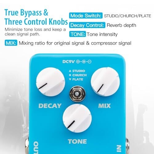 - Simple controls at your fingertips: adjust decay to shape tail length, mix to balance signal and effect, and tone to sculpt the reverb character for your rig.