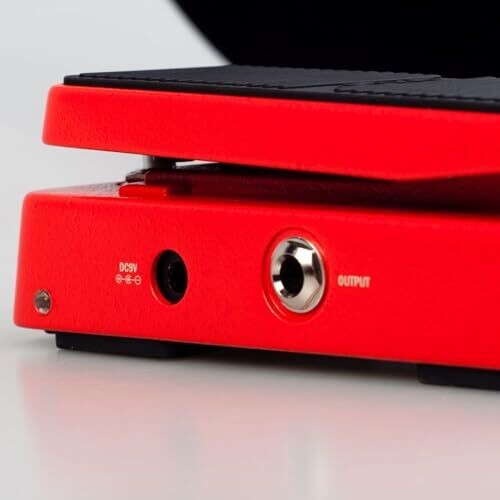 The Volume Control Mode is activated by a minimum volume adjustment knob, enabling controlled attenuation when toeing the pedal. LED indicators show working status and the pedal’s two-sided lights aid visibility. The pedal features a durable aluminum-alloy housing designed for live performance and transport. Input and output jacks allow connection to guitar, amplifier, or other pedals in the signal chain. The Wah Control uses a rocker mechanism to adjust the frequency sweep of the wah effect, enabling tone shapers from bassy to trebly.